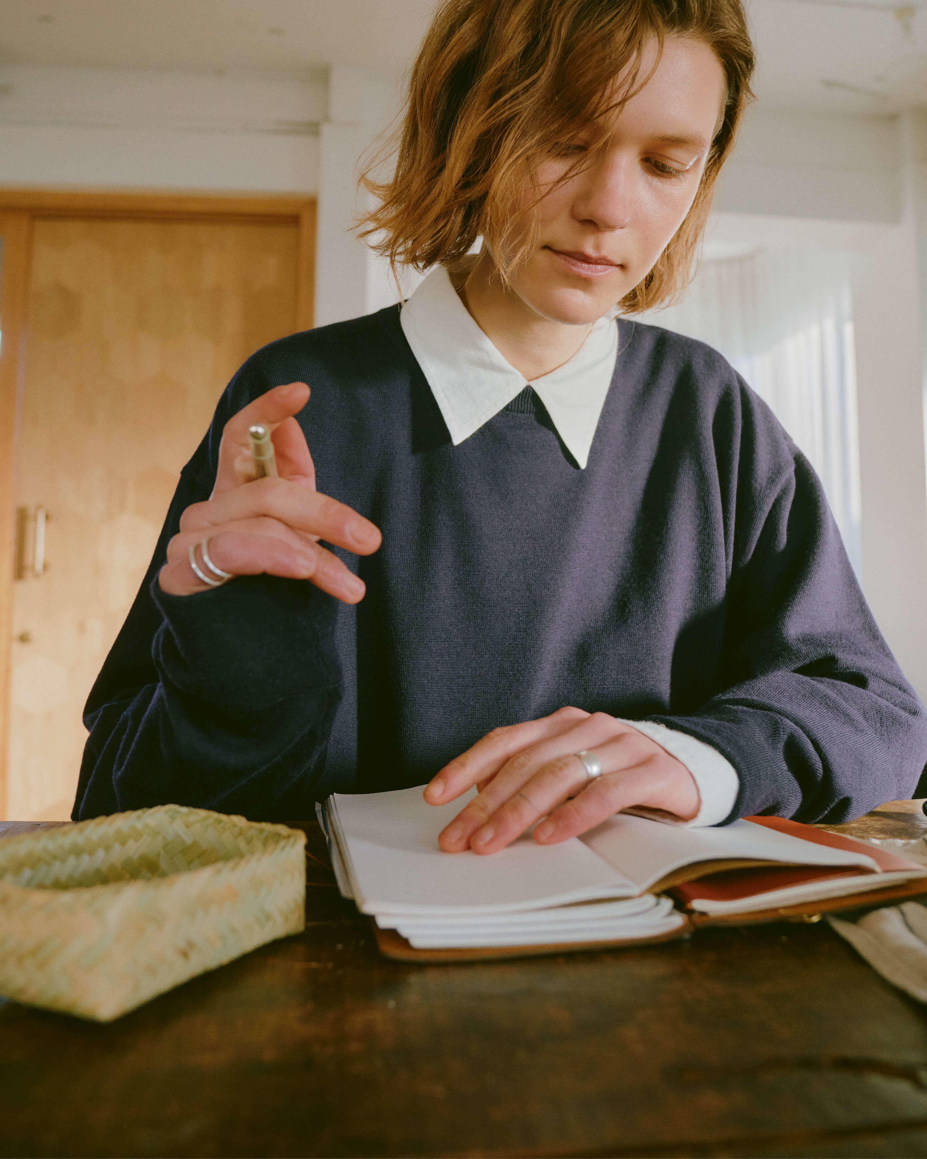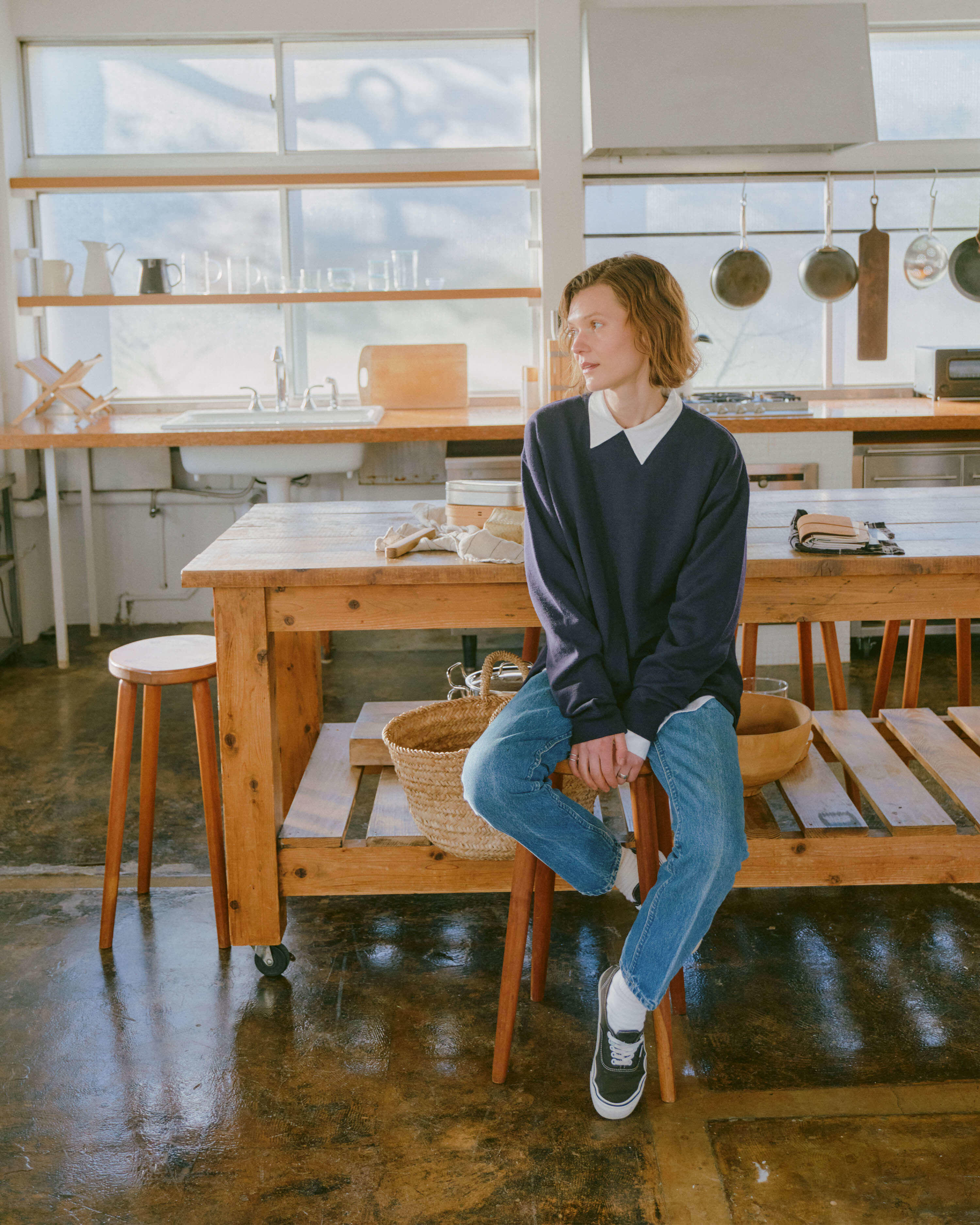 アレクサンドラ:まずこのスエットは着ていて心地がいいし、暖かいんです。暖かそうに見えて暖かくないものってたくさんあるけど、これはそんなことない。あとはカラーもいいですね。とてもエレガントなネイビーだと思う。そしてサイズ感やシェイプも素晴らしい。大きすぎず小さすぎないサイズ感で、自分のカラダが美しく見えるんです。