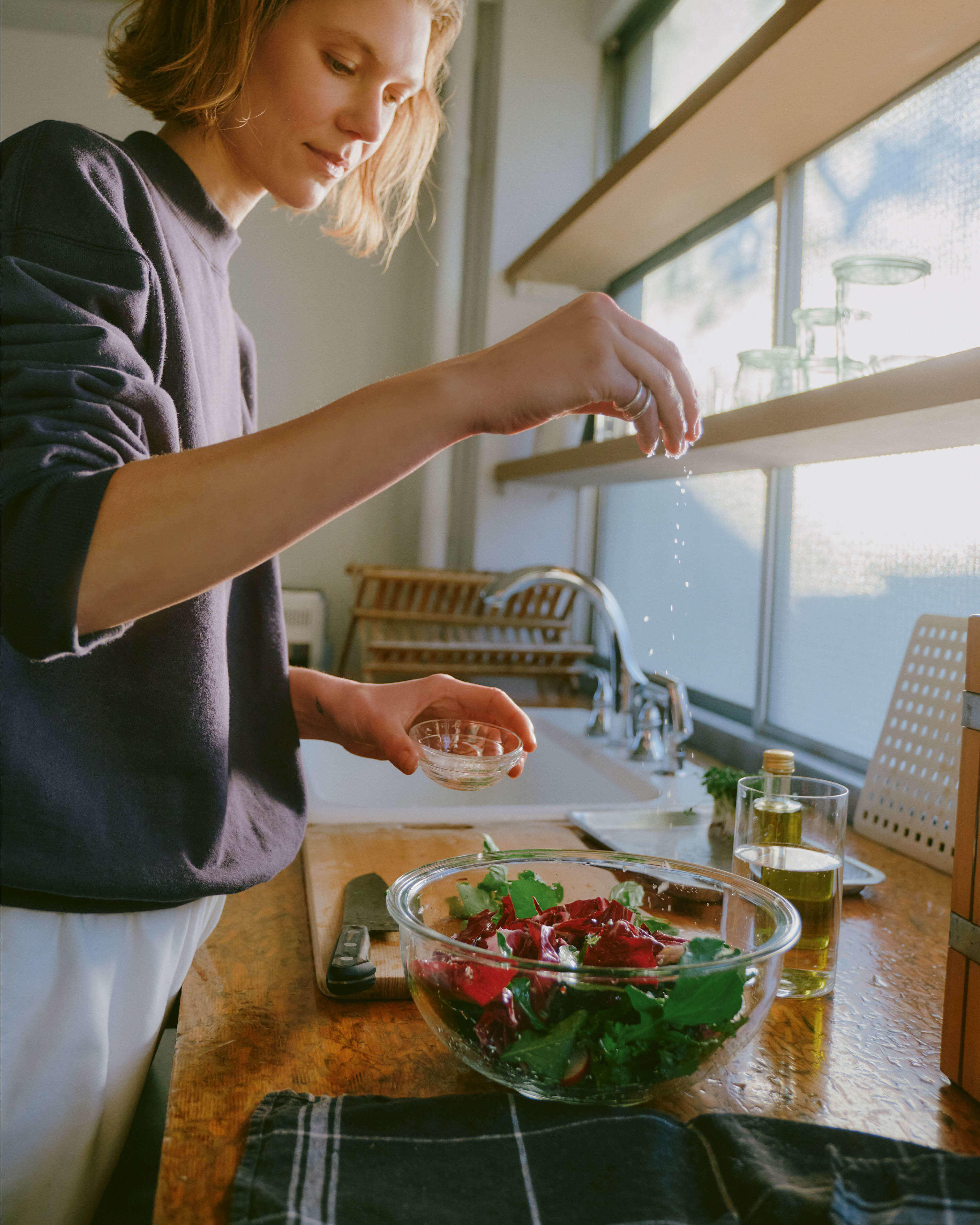 アレクサンドラ:塩ってすごいんですよ。同じ塩でも国や地域によって特徴が全然違う。私はすごくギークなので、興味が生まれるとどんどん深掘りしていっちゃうんです。日本でも47都道府県で全部違う塩が取れるんです。そんな国はなかなかなくて、それがすごくおもしろい。スモークされた塩があったり、粒が大きくてクランチな食感の塩もあったりして、それをどう料理で生かすかを考えるのが楽しい。本当にシンプルなおにぎりも、ちょっといい塩をかけるだけで見違えるように美味しくなります。だからいつも私は塩を持ち歩いているんです。