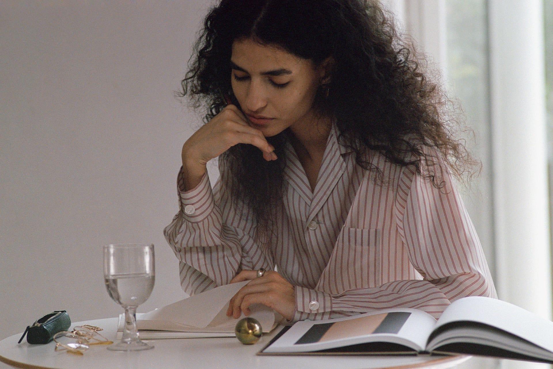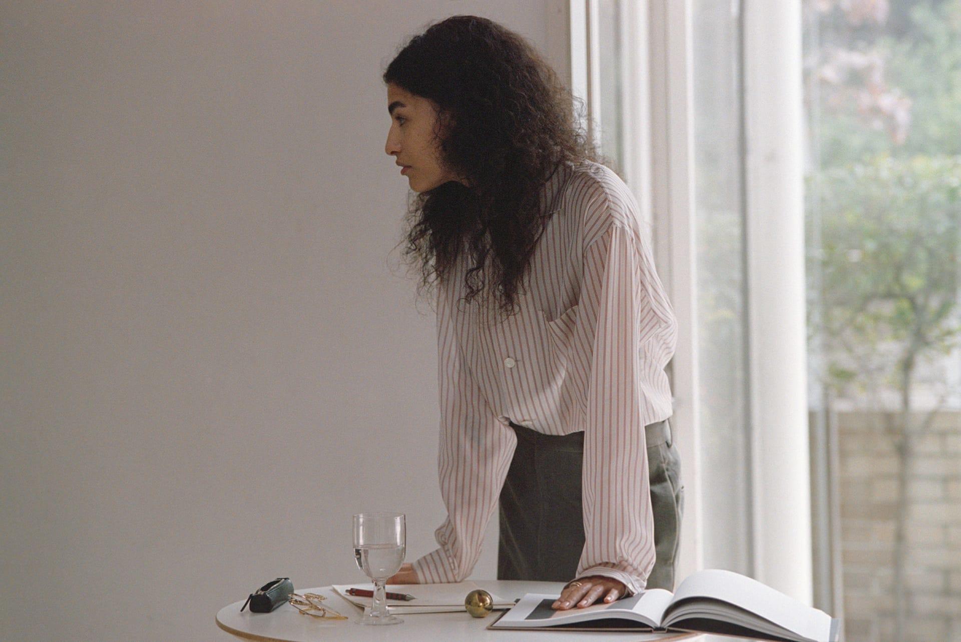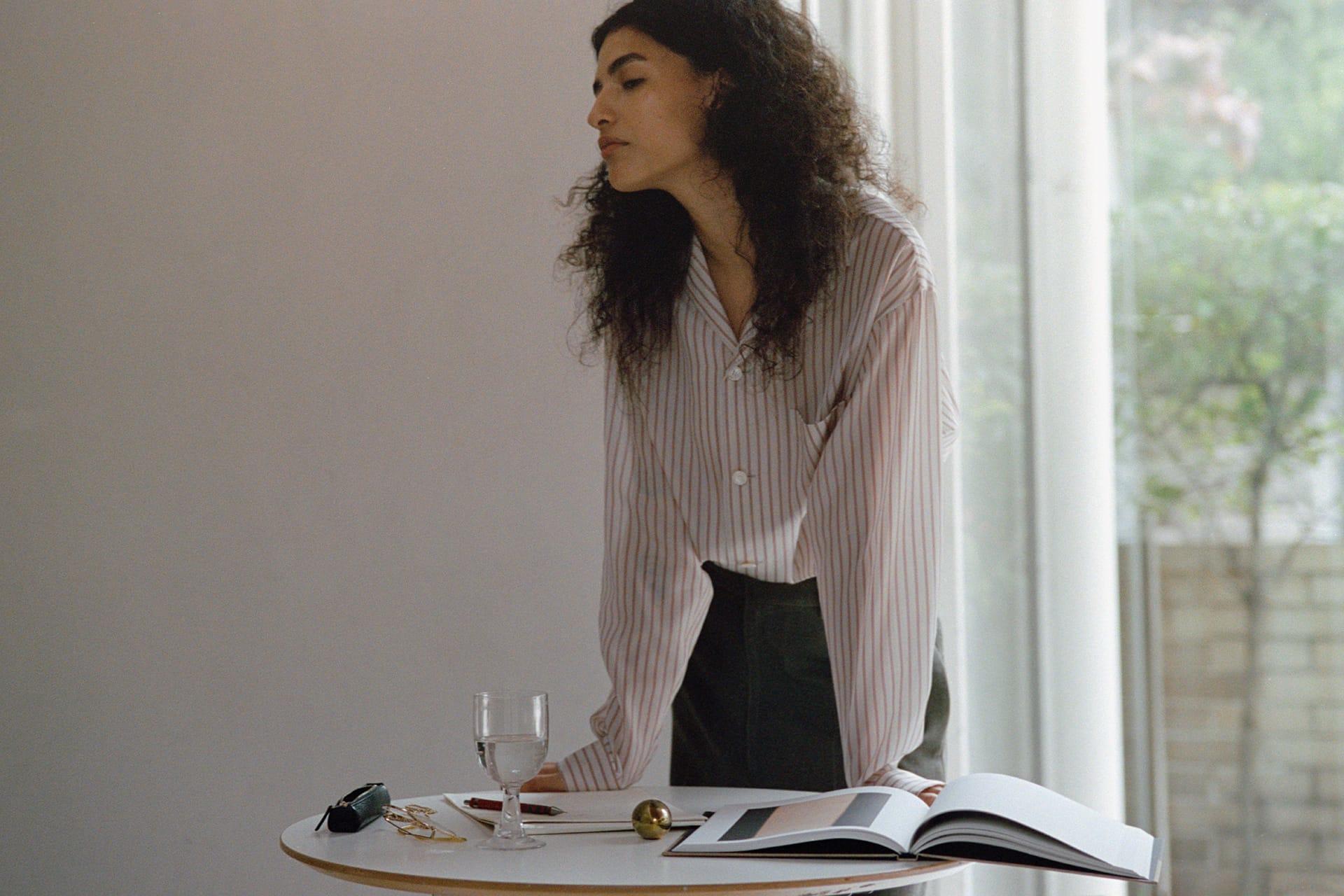 YLÈVEでは、女性があえてメンズサイズを選ぶことも想定してデザインを行ってきた。ボディコンシャスなシルエットによって女性らしい体の線を拾うのではなく、メンズライクな大きめの服を纏いながらも、袖口からのぞく手首の細さ、オープンカラーが作り出すデコルテの抜け感など、繊細なセンシュアルさも大切にしている。日常に溶け込み、さりげなく個性を漂わせるパジャマシャツとなった。
