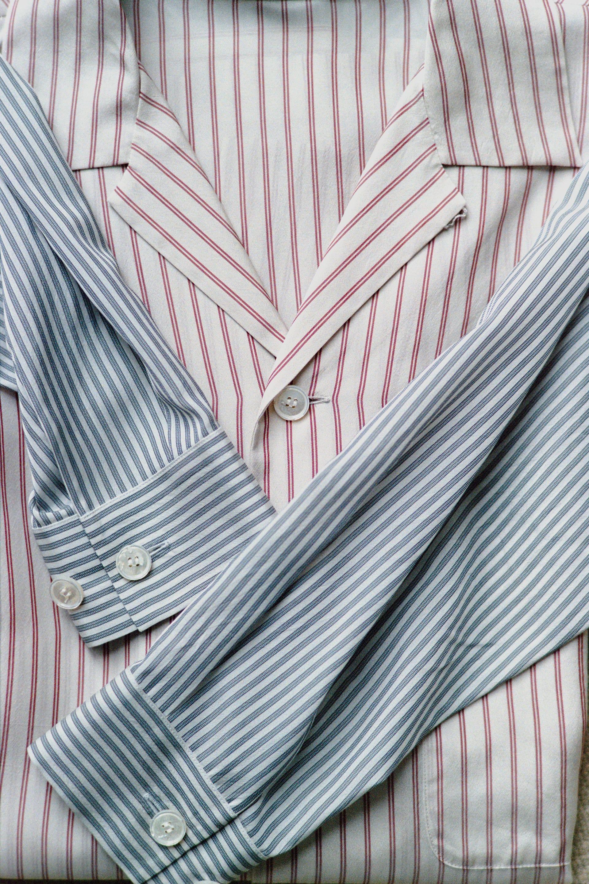 立体的なつくりであることに加え、このストライプの柄もまた、このパジャマシャツを構成する大切な要素である。ヴィンテージのジャケットの裏地に使われているような、肌離れのいいテキスタイル。柔らかいようでハリがあり、シャリ感のある質感は体の線を拾いすぎない。オーバーなシルエットであっても崩れすぎず、品を保つ。