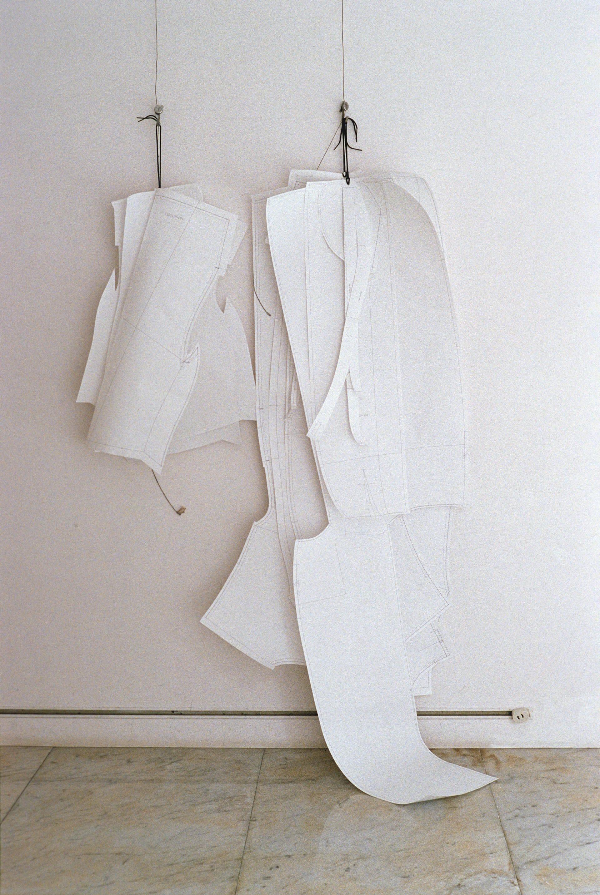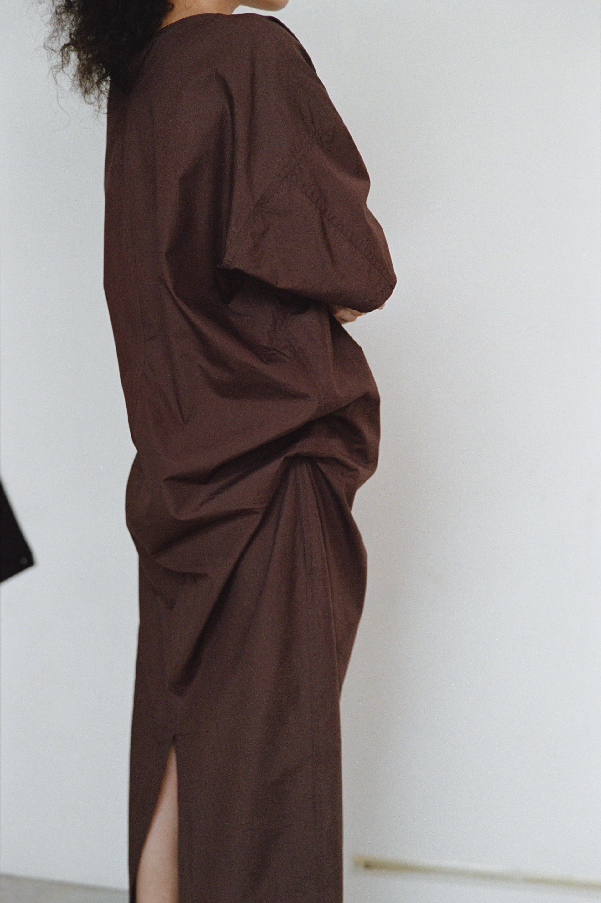 今回は、よりプリミティブに、最小限のパーツで切り替え線を入れない設計に。あえて、そのように徹底して平面にすることで、身に纏ったときに自然な立体感が生まれ、イレギュラーなドレープを描き出す。内側には、ウエストあたりの生地を、肩の方向へと引き上げるベルトが縫い付けられ、生地にテンションをかけることで、抑揚のあるたわみが生まれる。