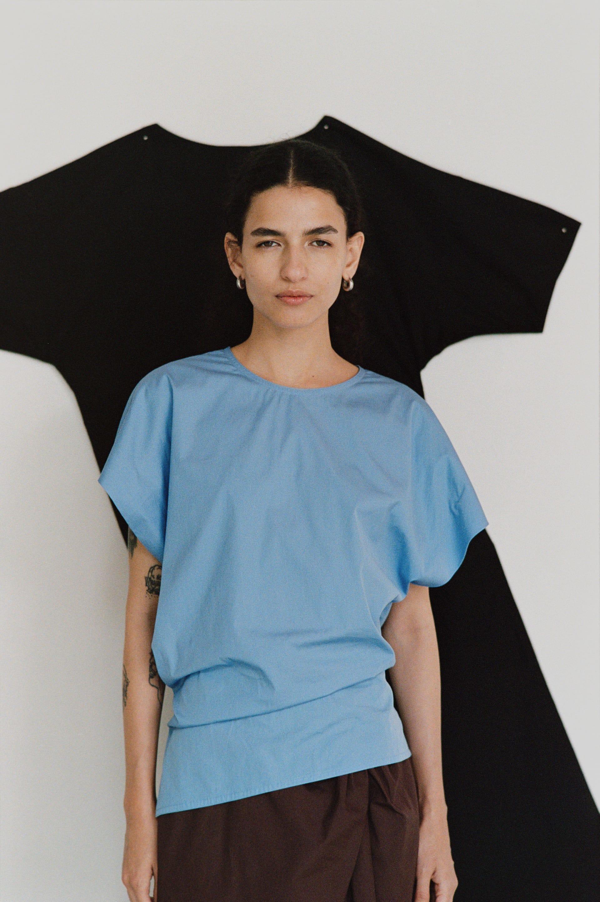 また、同じ発想のもとでデザインを行い、トップスとスカートもラインナップ。シリーズに共通する、アシンメトリーのデザインは、ワードローブに意外なアクセントを与えるが、YLÈVEらしい端正な仕立てによって、日常に馴染むアイテムとなる。